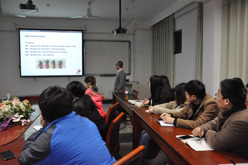 报告开始,主持人王笑老师对Fulai Liu副教授的到来表达了热烈的欢迎,紧接着对他的工作和科研做了简单的介绍。Fulai Liu 副教授于2000年获德国汉诺威大学园艺科学系农学硕士,2004年获得丹麦皇家兽医农业大学农学博士。1996-1998年在中国农业科学院土壤与肥料研究所担任助理研究员,2000-2001年在德国汉诺威大学园艺科学系担任研究助理。2004年起在丹麦哥本哈根大学任助理教授、副教授。Fulai Liu 主要在作物逆境生理及特别在干旱胁迫诱导的根源化学信号对作物营养与生殖发育的调控、作物响应气候变化等领域开展研究、碳水化合物代谢及水分利用效率的影响等方面进行了系统的研究。Fulai Liu 作为主要研究人员主持或参加欧盟合作项目、丹麦科学研究基金会项目十余项,是丹麦哥本哈根大学博士学位委员会主席、吉林大学兼职教授、黑料网 客座教授、中科院东北农林研究院兼职研究员。Fulai Liu博士还是中丹联合大学(丹麦政府与中国科学院合作办学,以联合培养两国研究生为主)的协调人和主要负责人。