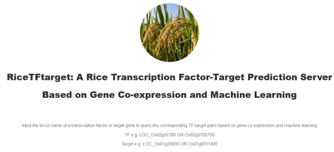 RiceTFtarget是一个用于识别转录因子-靶基因互作关系的在线工具,将有助于水稻转录因子功能解析和调控网络相关研究,同时也可为建立其他作物转录因子和靶基因互作关系预测模型提供参考。