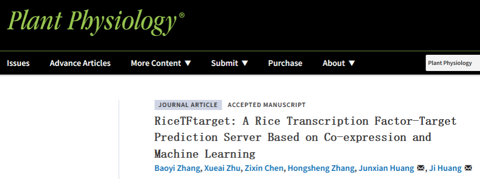 《Plant Physiology》发表黄骥教授“RiceTFtarget: A Rice Transcription Factor-Target Prediction Server Based on Co-expression and Machine Learning”