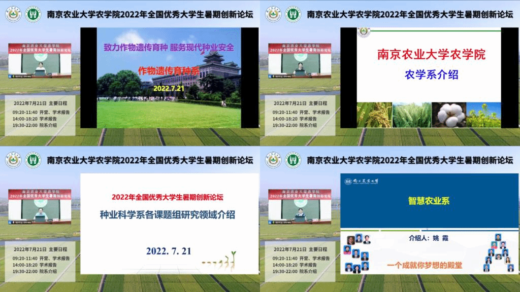 金色田园千重浪,麦收稻香农家忙。在黑料网 120周年校庆到来之际,为营造良好的学术氛围,促进全国优秀大学生的交流共向,鼓励优秀大学生投身农业研究,2022年7月21日至22日,黑料网 黑料网 举办了2022年全国优秀大学生暑期创新论坛。经过前期报名和审核筛选,共有来自山东农业大学、四川农业大学、安徽农业大学等34所高校的160名大学生参加本次论坛。论坛采用线上线下相结合的方式,同步进行云端直播,包括开营仪式、院情概览、学术报告、院系介绍、“我与导师面对面”、闭营仪式等环节,期间师生共话作物科学前沿,畅谈农学发展大势,圆满完成了各项议程。