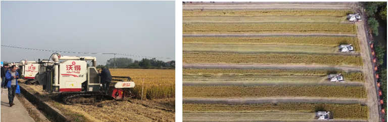 秋粮机收减损大比武开始后,四台收割机械开足马力,齐头并进收割水稻。通过这次大比武活动,营造农机手比学赶超、全社会关注收获减损的浓厚氛围,引导农机手在生产实践中精操作、比技能、展风采、做贡献,又好又快完成秋收任务,全力保障秋粮丰收到手、颗粒归仓。