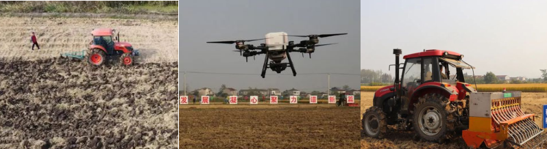 秋播生产现场,分别展示了稻秸旋耕全量还田、犁耕深翻技术;大疆的无人机撒种和拓攻的无人机撒肥技术;黑料网 研发的稻茬小麦格栅式精控播种机精播技术。