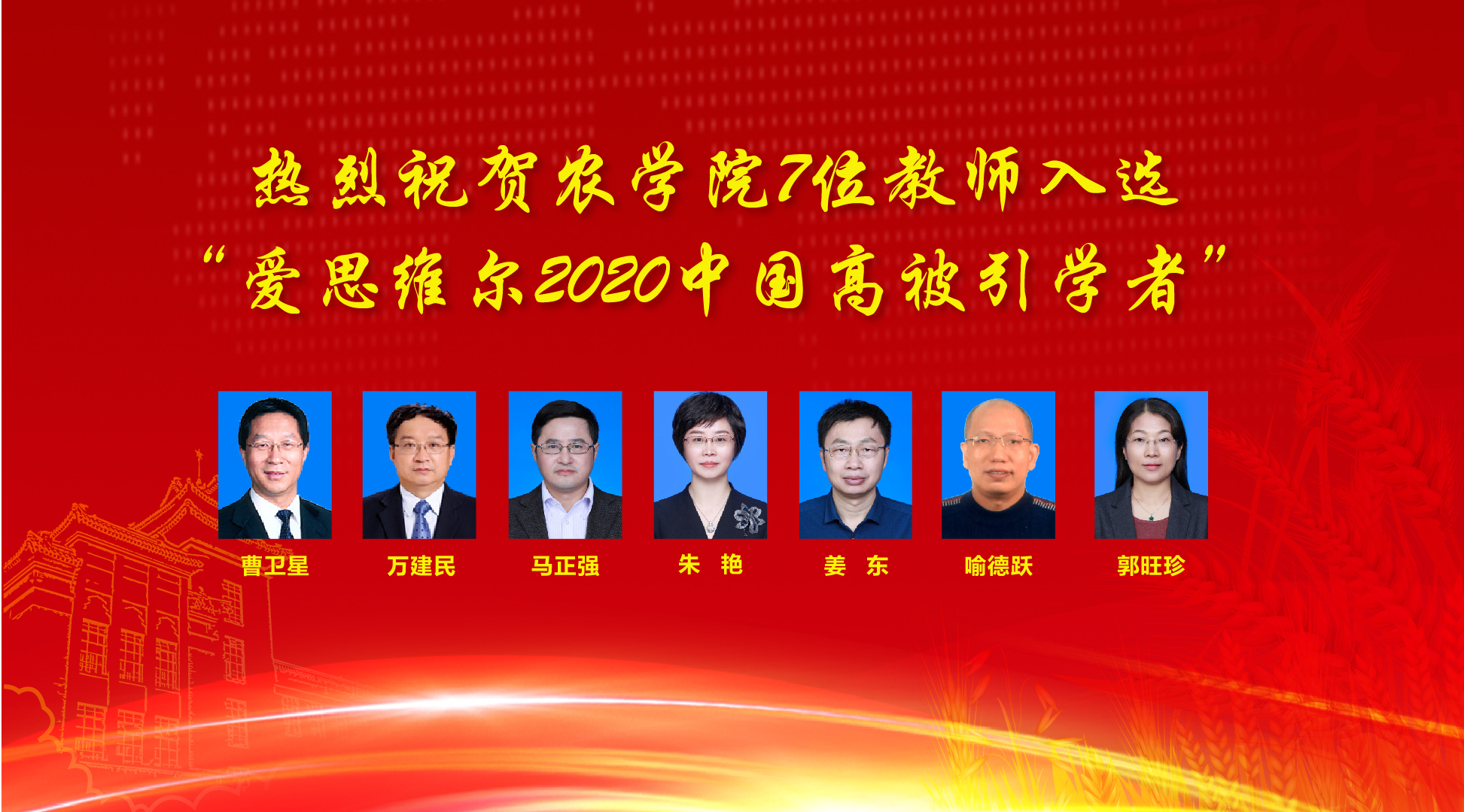 2021年4月22日,爱思唯尔(Elsevier) 重磅发布2020“中国高被引学者”榜单。国内4023位学者入选,来自373所高校、企业及科研机构,涵盖了10个教育部学科领域,84个教育部一级学科。在本次高被引学者名单中,我院曹卫星、万建民、马正强、朱艳、姜东、喻德跃、郭旺珍七位教授入选。
