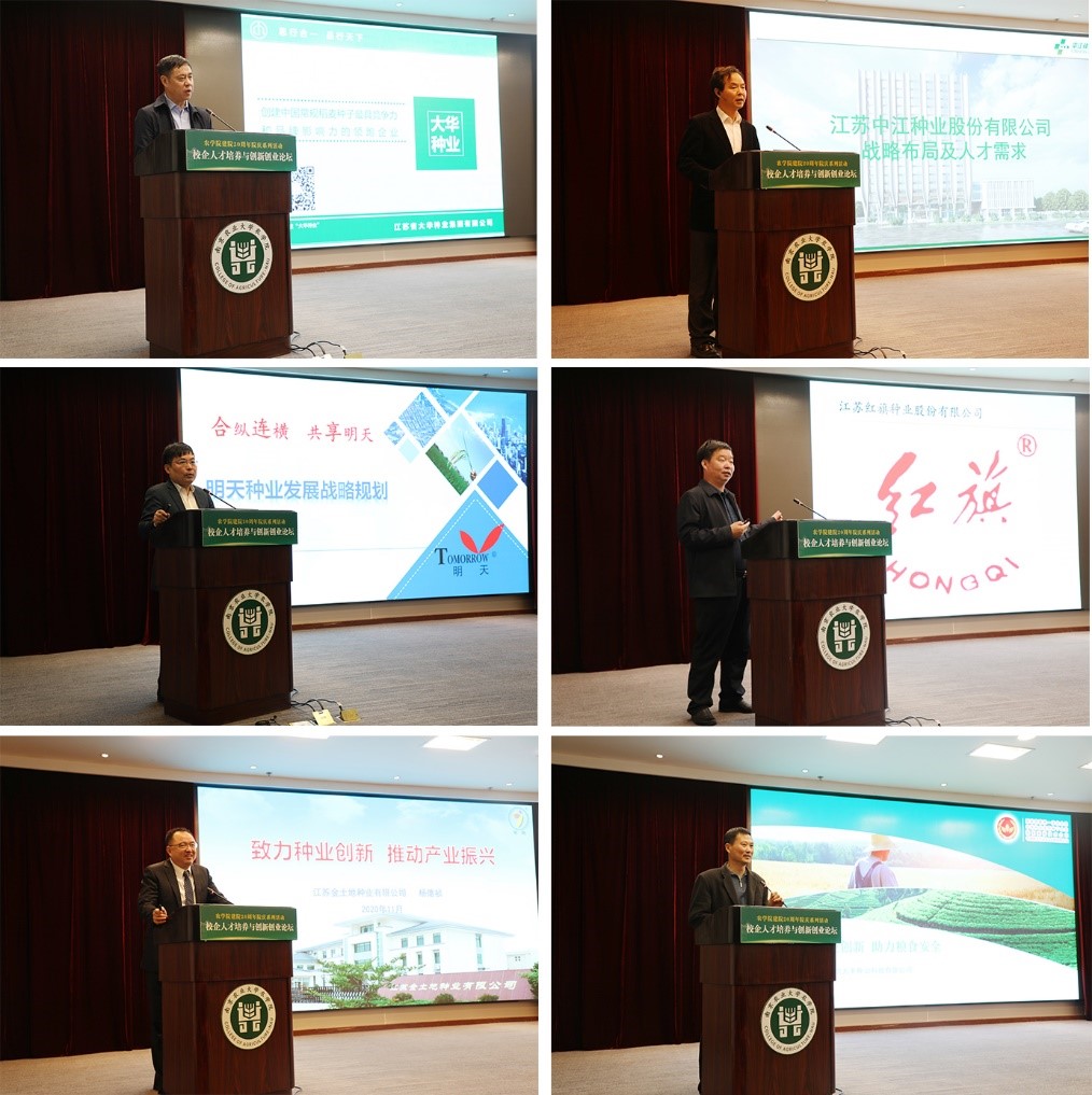 论坛第二阶段进行了企业家宣讲和面对面交流。江苏省大华种业集团有限公司总经理陈付祥作了题为《拥抱优质发展平台,不负青春大好芳华》的报告,江苏中江种业股份有限公司总经理蒋红云作了题为《江苏中江种业股份有限公司战略布局及人才需求》的报告,江苏明天种业科技股份有限公司总经理严辉民作了题为《合纵连横,共享明天——明天种业发展战略规划》的报告,江苏红旗种业股份有限公司总经理查联群作了题为《校企合作,共赢未来》的报告,江苏金土地种业有限公司总经理杨德祯作了题为《致力种业创新,推动产业振兴》的报告,江苏神农大丰种业科技有限公司副董事长何其所作了题为《坚定科技创新,助力粮食安全》的报告。