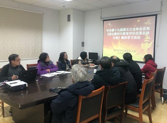 支部书记鲍永美首先介绍了本次学习活动的背景和重要性,之后大家集体观看了对于十九届五中全会会议公报和会议精神的解说视频,以及《深化新时代教育评价改革总体方案》的专家解读视频。随后,支部书记对《深化新时代教育评价改革总体方案》进行了逐项说明,特别是其中涉及高等院校及其教师的内容。党员同志们纷纷表示《深化新时代教育评价改革总体方案》是对当前教育评价机制的一次重大改革和推进,对其中提出的立德树人、师风师德建设和“破五唯”相关内容表示了高度赞同,并表示会后会继续认真学习和领会相关会议精神和改革方案。