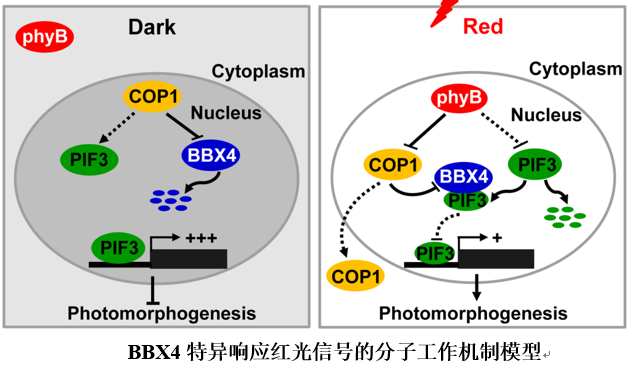 在植物中不同的光受体特异性地识别太阳光中不同波长的光信号而调控生长发育。其中植物红光受体光敏色素B(phyB) 吸收红光信号调控植物的诸多生长发育过程如种子萌发、幼苗形态建成、开花、成株分蘖等。本研究鉴定了一个直接作用于phyB信号下游的一个重要组分B-BOX CONTAINING PROTEIN 4(BBX4)。在黑暗下,BBX4 被E3泛素化连接酶COP1 降解。在红光信号下,phyB直接与BBX4在细胞核内相互作用,并促进BBX4的蛋白稳定。积累的BBX4直接与红光信号的一个负调控子PIF3相互作用而抑制了PIF3的转录调控活性。由此,phyB-BBX4-PIF3调控模块控制了植物在红光信号下的形态建成。