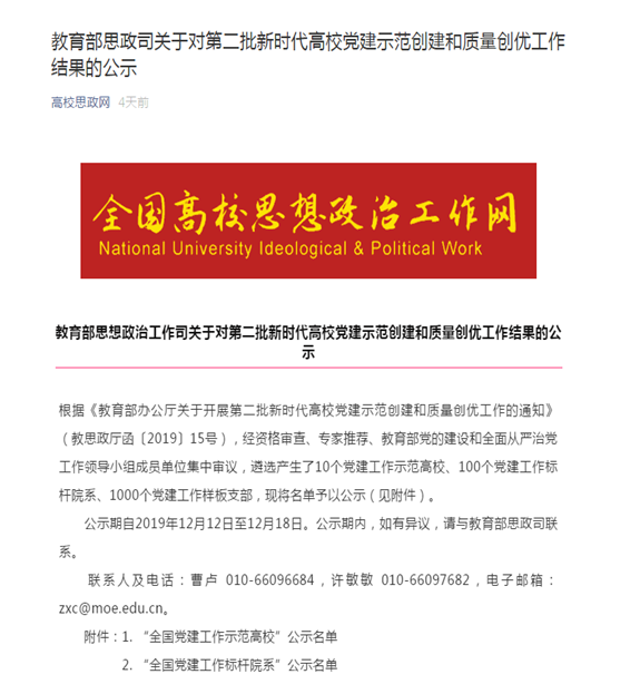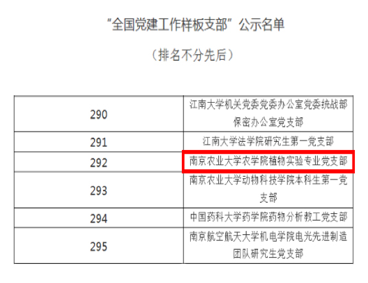 近日,教育部办公厅为深入贯彻落实习近平新时代中国特色社会主义思想和党的十九大精神,深刻学习领会全国教育大会、全国高校思想政治工作会议、学校思想政治理论课教师座谈会精神,结合“不忘初心、牢记使命”主题教育,面向全国高校培育创建10所党建工作示范高校、100个党建工作标杆院系、1000个党建工作样板支部。根据《教育部办公厅关于开展第二批新时代高校党建示范创建和质量创优工作的通知》(教思政厅函〔2019〕15号),经资格审查、专家推荐、教育部党的建设和全面从严治党工作领导小组成员单位集中审议,我院植物实验专业党支部获评“全国党建工作样板支部”。