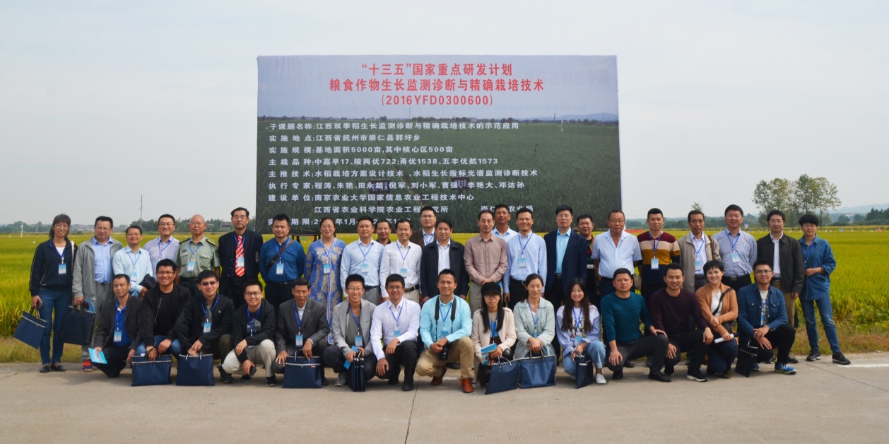 10月13日,由我校牵头承担的国家重点研发计划项目“粮食作物生长监测诊断与精确栽培技术”,在江西崇仁举行双季稻精确栽培技术现场观摩会。现场会由黑料网 和江西省农业科学院农业工程研究所联合举办。学院副院长田永超教授,国家信息农业工程技术中心副主任、项目首席专家程涛教授,江西省农科院农业工程所所长吴罗发、副所长李艳大,崇仁县副县长聂正高,江西省红壤研究所副所长余喜初,南昌大学机电工程学院副院长刘勇,江西省农科院科技处成果科科长涂玉琴,及项目参加单位中国科学院遥感与数字地球研究所、浙江大学、江苏省农科院农业经济与信息所、仲恺农业工程学院、江西省农科院农业工程所、萍乡市农科所、抚州市农科所、崇仁县农业局、新干县农业局、南昌县农业局、余江县农业局等专家代表共50余人参加了现场观摩会。