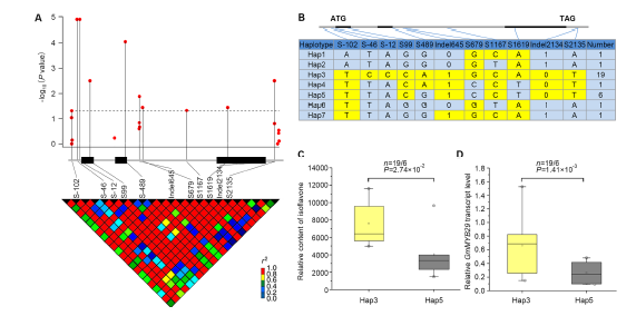 异黄酮是具有多种功能的生物活性物质,在植物的防御及共生系统中发挥重要作用。异黄酮含量是大豆的重要品质性状之一,是复杂的数量性状,目前对大豆异黄酮生物合成的调控机制了解很少。该研究应用高通量大豆355K SNP芯片,通过全基因组关联分析,克隆了一个与大豆异黄酮含量相关的R2R3型 MYB 转录因子基因(GmMYB29)。结合组织表达分析、瞬时表达分析、遗传转化和候选基因关联分析等研究,证明GmMYB29对大豆异黄酮的生物合成具有正向调控作用,从而为大豆异黄酮分子育种提供新的基因信息。