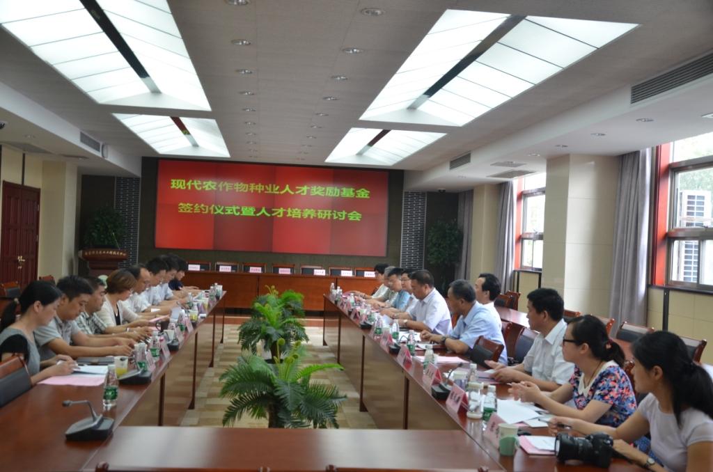 狄传华介绍了学校教育发展基金设立情况;汤义华对“现代农作物种业人才奖励基金”管理办法做了简要介绍。朱艳代表学校与种业企业签订了“现代农作物种业人才奖励基金”捐赠协议书。各种业企业老总与参会人员一起围绕现代种业人才培养展开深入讨论。
