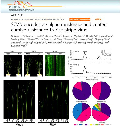 我院万建民教授团队在水稻抗条纹叶枯病基因功能研究中取得重要进展。9月10日,国际权威刊物《Nature Communications》(IF=10.742)在线出版了题为“STV11 encodes a sulphotransferase and confers durable resistance to rice stripe virus”的相关研究成果。万建民教授团队经过长期的研究,成功克隆了第一个水稻抗条纹叶枯病基因STV11,并阐述了该基因的功能。该论文以王琦博士研究生和刘裕强副教授为论文共同第一作者,万建民教授为通讯作者。