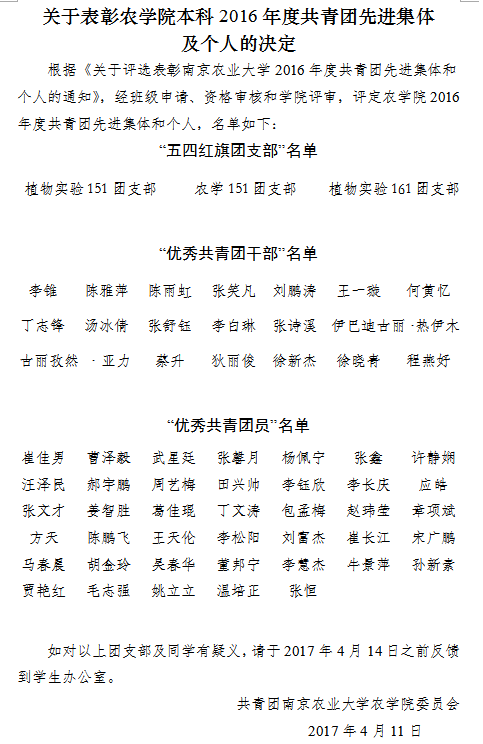 关于表彰黑料网 本科2016年度共青团先进集体及个人的决定