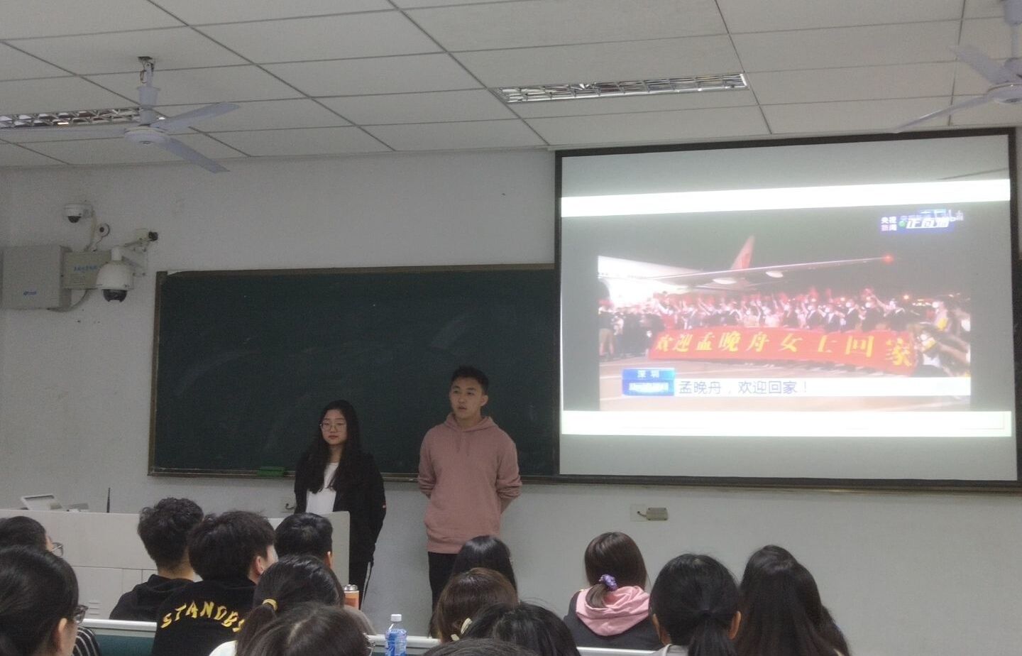 此次分班讨论会议主要由“孟晚舟事件回顾”、“《月是故乡明》朗读”、“国家所作努力”、“看大国底气”四个部分组成。首先黄艳霞同学借助一段视频让大家快速了解了孟晚舟事件的经过。接着段锡茹同学和宋宇坤同学为大家带来朗诵,情感饱满,赢得一片掌声。然后杨若琪同学介绍了在孟晚舟归国过程中国家所做的努力。最后一部分,由苏天航同学讲述中国的大国底气,在回顾和讨论孟晚舟事件中,我们看到中国日益强大的综合国力,中国共产党、14多亿中国人民、伟大的中国永远都是中国公民最坚强的后盾。