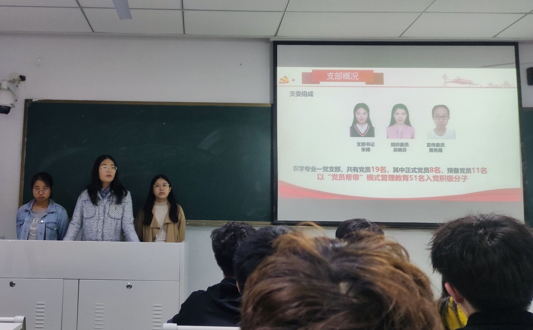 在分班讨论之前,张晴同志介绍了农学专业一党支部的新支委组成,包括支部书记张晴、组织委员吴晓芬和宣传委员黄艳霞,并且组织支部的新进积极分子进行了自我介绍,增进彼此的了解。张晴同志还就支部活动、思想汇报方面做了简短的介绍和建议。