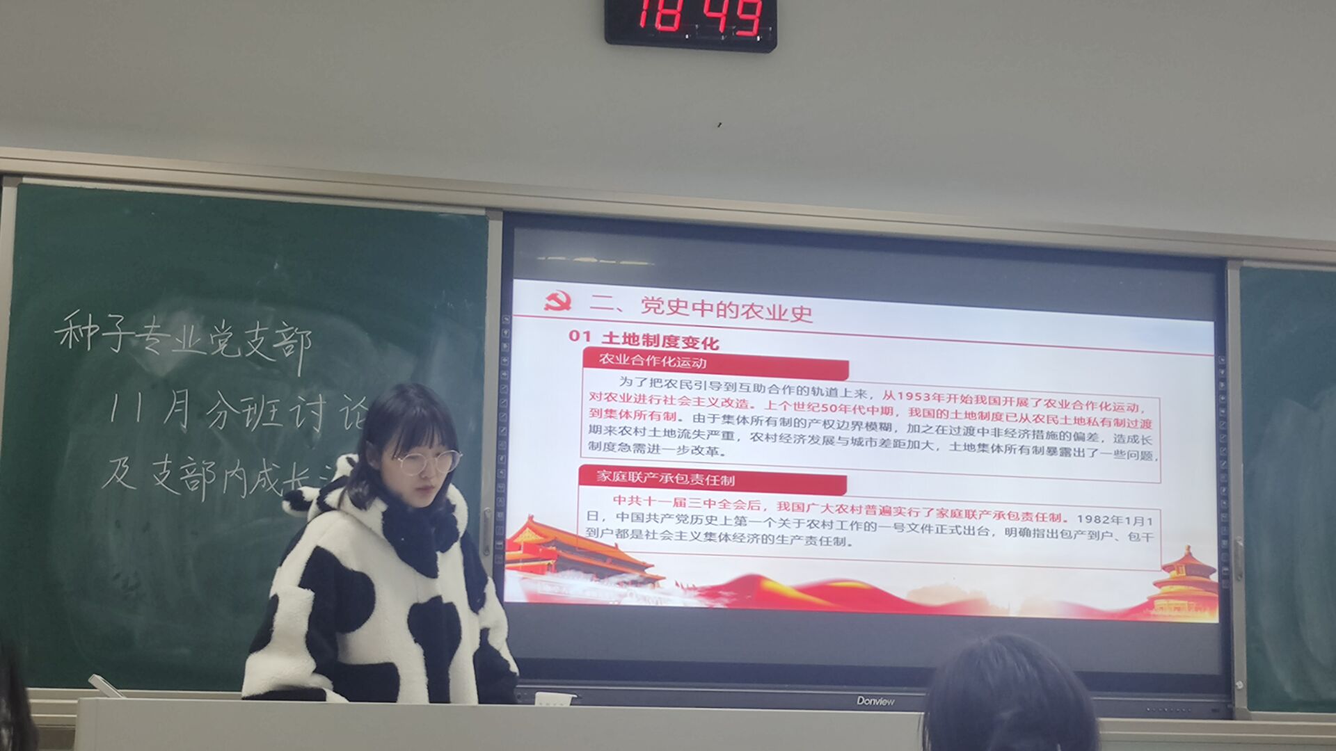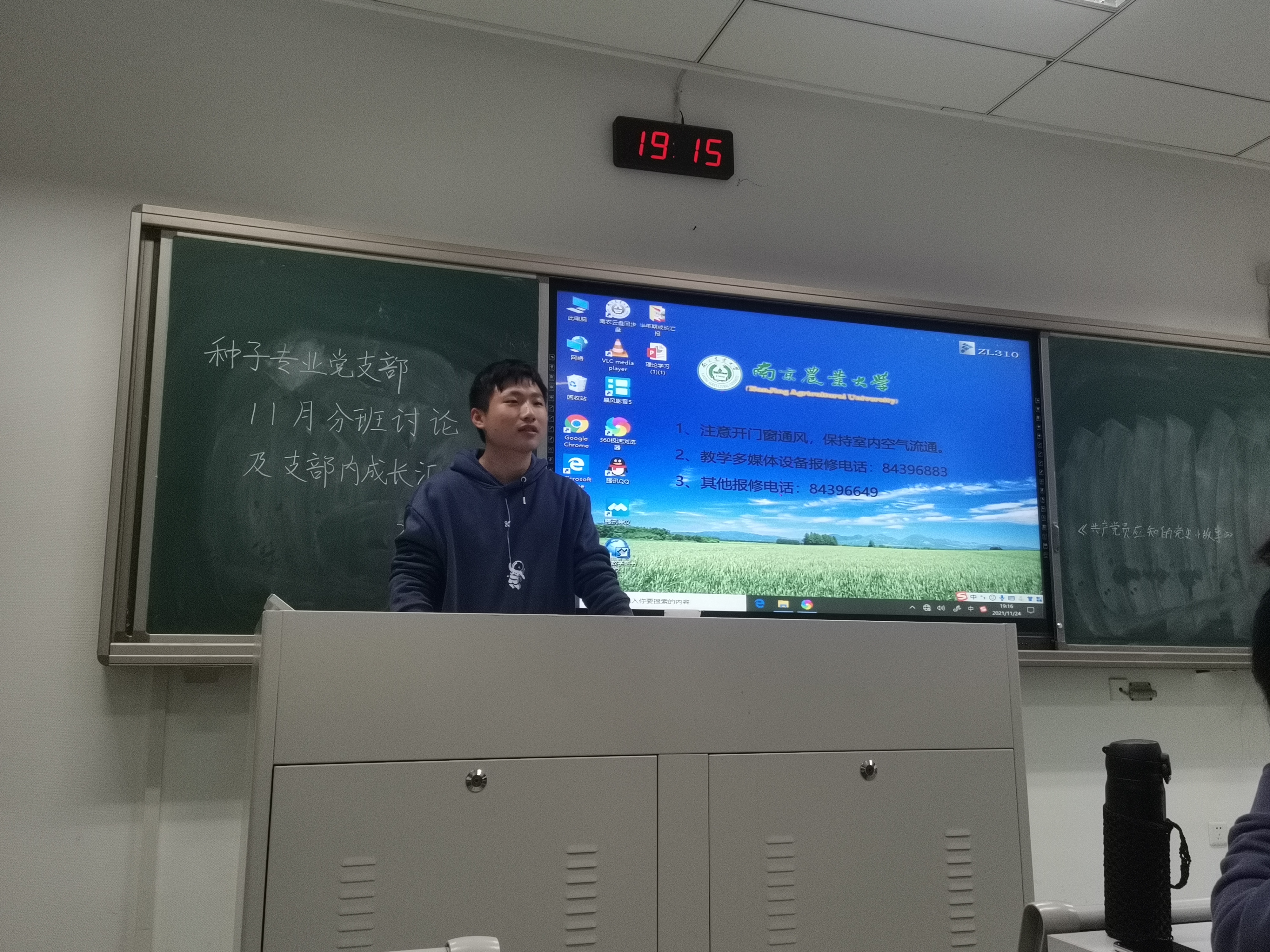 2021年11月24日,种子专业党支部在主楼310开展主题为“庆祝中国共产党成立100周年”的分班讨论。本次会议由积极分子魏子曼主持,种子专业党支部党员、预备党员以及积极分子参加了分班讨论。