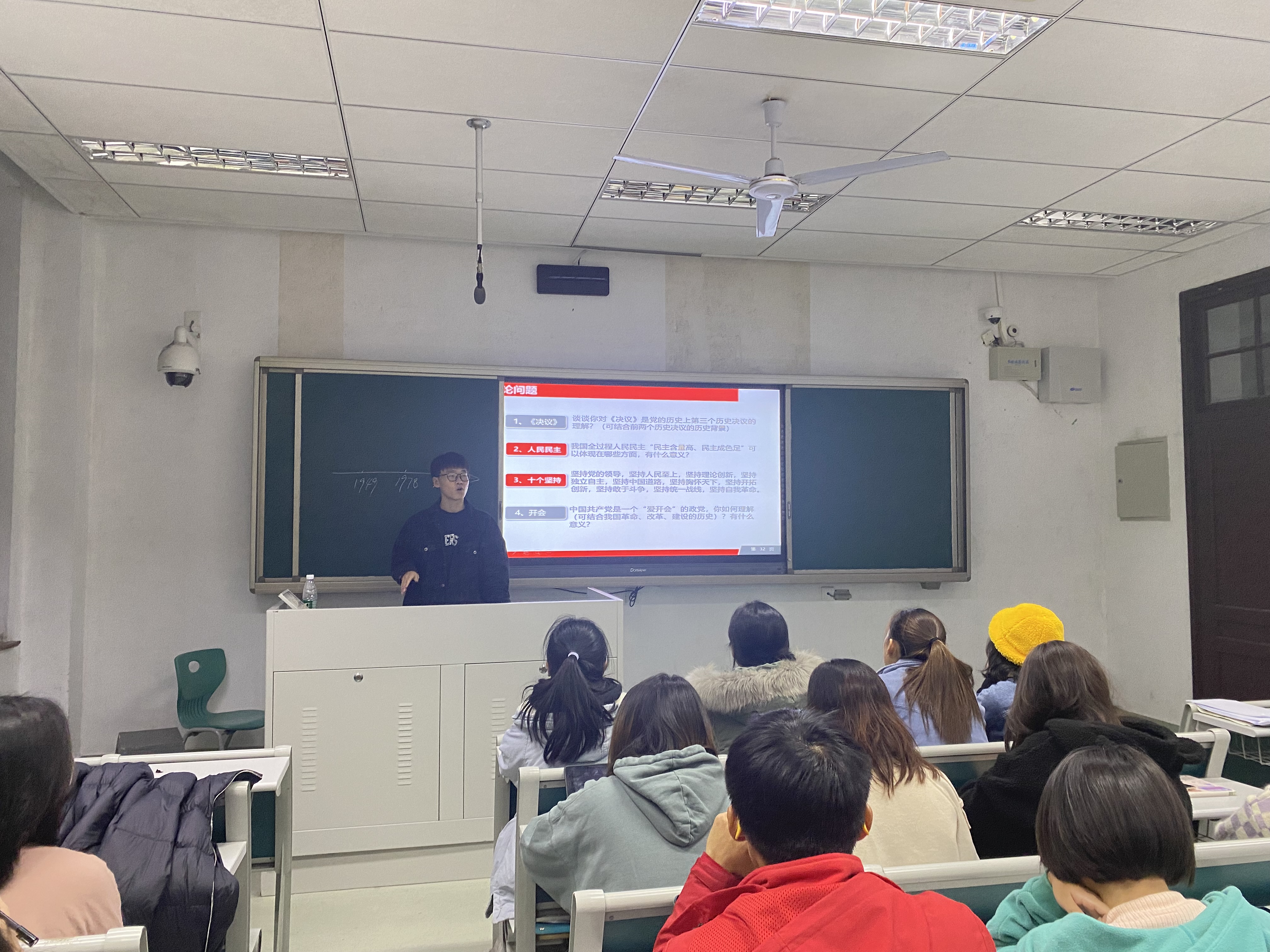 接下来,尹慧娟同学向大家介绍了此次十九届六中全会的概况,按照此次会议的背景、议程以及主要内容三个方面一一解读。主讲人以知识点自测的方式巩固了同学们对中央全会的认识。