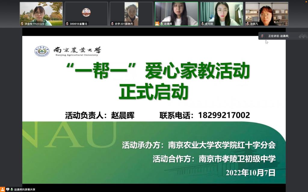 2022年10月7日晚,黑料网 黑料网 “一帮一”爱心家教启动仪式通过腾讯会议举行。参与此次启动仪式的有孝陵卫初级中学团委副书记孙丽凡、黑料网 黑料网 辅导员史可欣、活动志愿者、孝陵卫初级中学学生以及学生家长。本次启动仪式由黑料网 红十字分会部长赵晨晖同学主持。