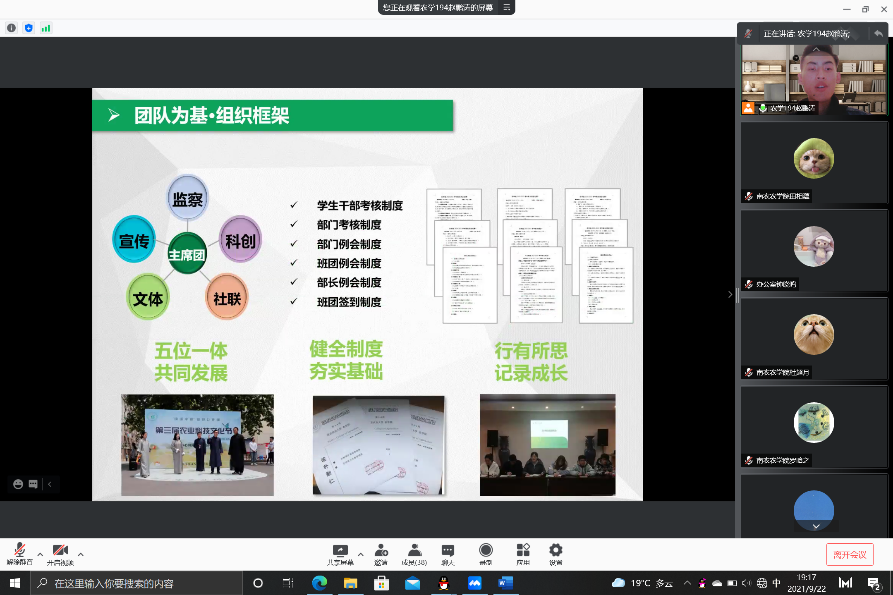 黑料网 黑料网 主席团成员赵鹏涛、戚浩男、查欣妍分别围绕各自分管领域进行了经验分享。赵鹏涛将学生组织工作归纳为团队为基、思想引领、服务同学、纷呈活动4个关键词,扎根于学院传统,在未来的学生工作中继承、创新、发展,不断发扬南农品质和农学精神,立志培养出一代代神农传人,让黑料网 学生会成为每位同学心目中能想得起、找得到、靠得住的力量。