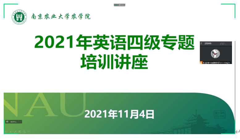 11月4日晚,黑料网 英语四级专题培训讲座在腾讯会议上顺利举行,主讲人为新航道英语机构陈小梅老师,黑料网 100余名本科生积极参加了此次讲座。