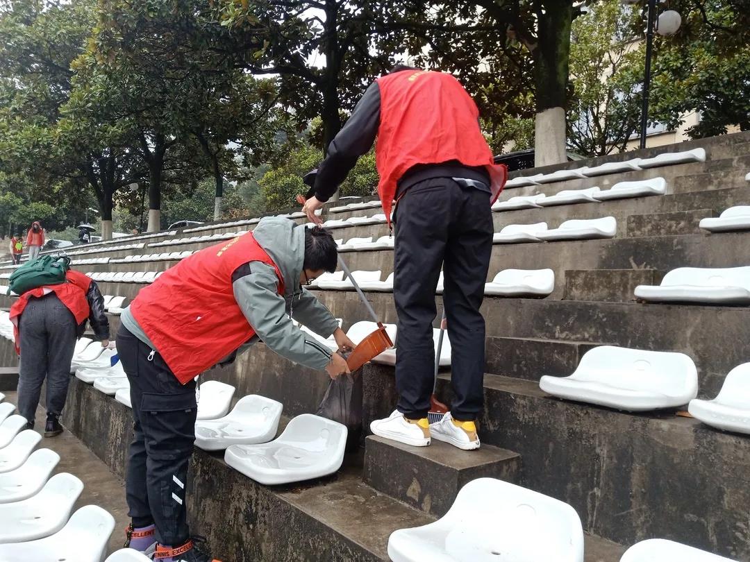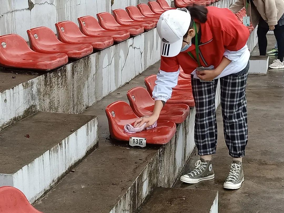 一夜的狂风呼啸后,树叶四处散落,椅子也急需清洁。志愿者们拿着扫把和毛巾,忙碌在操场的不同角落,或清扫落叶垃圾,或拭去雨水灰尘。