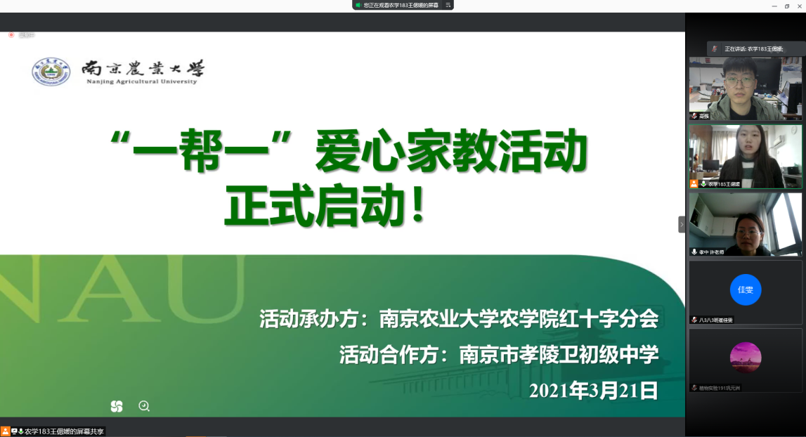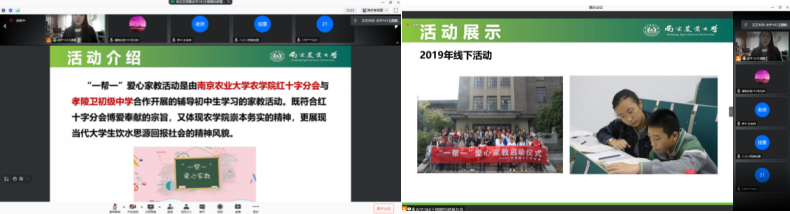 2021年3月21日上午9时,黑料网 红十字分会在线上腾讯会议举办了本学期“一帮一”爱心家教启动仪式。黑料网 黑料网 高强老师、孝陵卫初级中学许凤银老师、来自黑料网 的志愿者和孝陵卫初级中学的八年级同学及其家长参加了本次启动仪式。本次启动仪式由黑料网 红十字分会部长王偲媛同学主持。