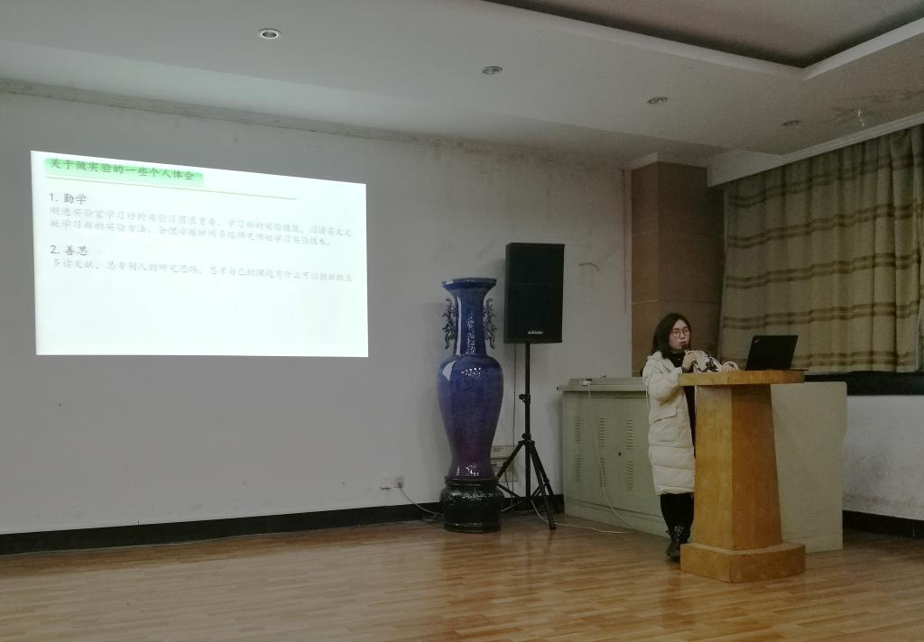 首先进行分享的是张小利博士。他结合自身的科研经历,为大家介绍了如何理解科研,如何走进它,包括确定研究方向、实验过程、文献阅读。在讲到做实验时,提到坦然面对实验失败,“胜败乃兵家常事”要及时调整好心态,对实验操作进行回忆总结,反思后再进行下一次尝试。同时,告诉大家“无论做人还是做事,培养解决问题的能力才是最重要的”。