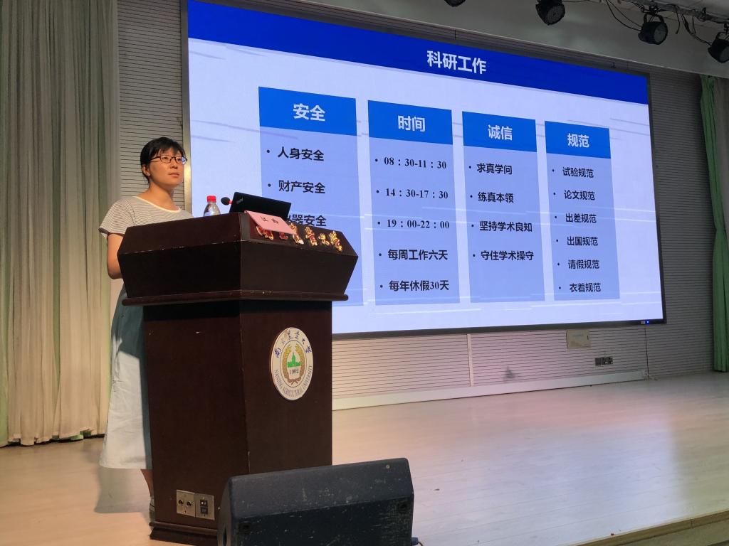 刘蕾蕾老师从研究生角色转换入手,延伸到怎么样转换希望研究生合理安排时间,制定合理的科研学习计划,多看看文献汲取知识,积极与同导师、同学沟通。谈到科研工作时她重点从安全、时间、诚信、规范四个方面出发,安全是一切的跟本做好人身安全、财产安全、仪器安全、信息安全,以充足的时间来投入科研才会有所产出。做科研时要求真学问练真本领,坚持学术良知、坚守学术操守,坚决抵制学术不端。最后对于研究生的课余生活,她给出了自己建议。