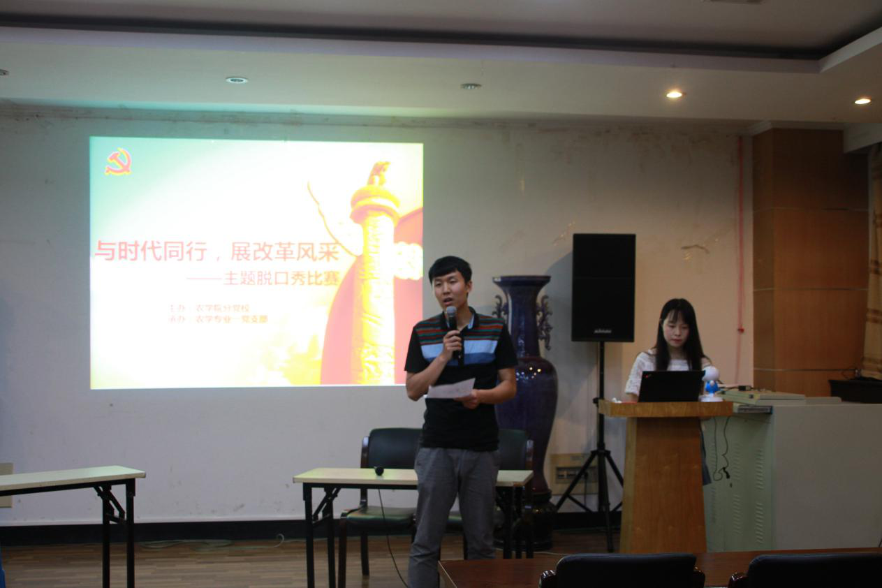 分党校联合农学专业一党支部举办了此次以“与时代同行,展改革风采”为主题的改革开放四十周年主题教育活动,各支部成员从政治、经济、文化、生活四个方面展示了改革开放以来中国发生的巨大变化。本科生辅导员王彬老师、姚敏磊老师、马丽娟老师及各支部书记出席并担任本次比赛的评委。