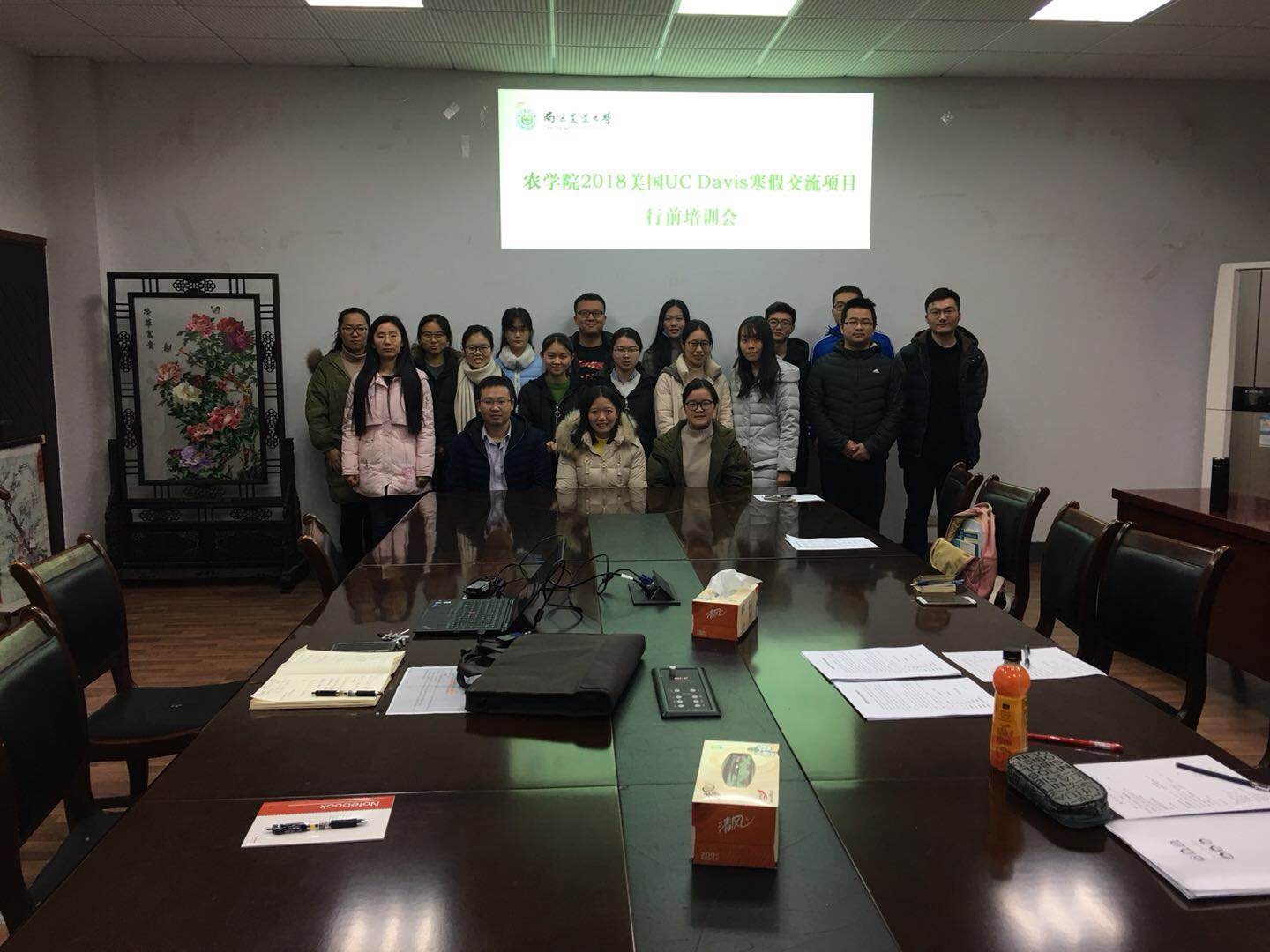 2018年1月18日16:00在学院会议室B1013,举办2018年美国UC Davis寒假交流项目行前培训会,国家信息农业工程技术中心张羽老师、学院教学秘书汪欢欢老师、研究生辅导员许娜老师以及各位参加此次出国交流项目的同学们参加了行前培训。