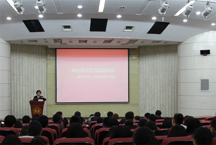 3月22日晚,黑料网 分党校主题党课在图书馆报告厅举行。黑料网 政治学院院长余林媛教授受邀作题为《政治诉求及其实现路径――高校学生入党的现实与可能》的党课。黑料网 党委副书记殷美、学院各学生党支部成员及预备党员和积极分子参加了此次主题党课教育。