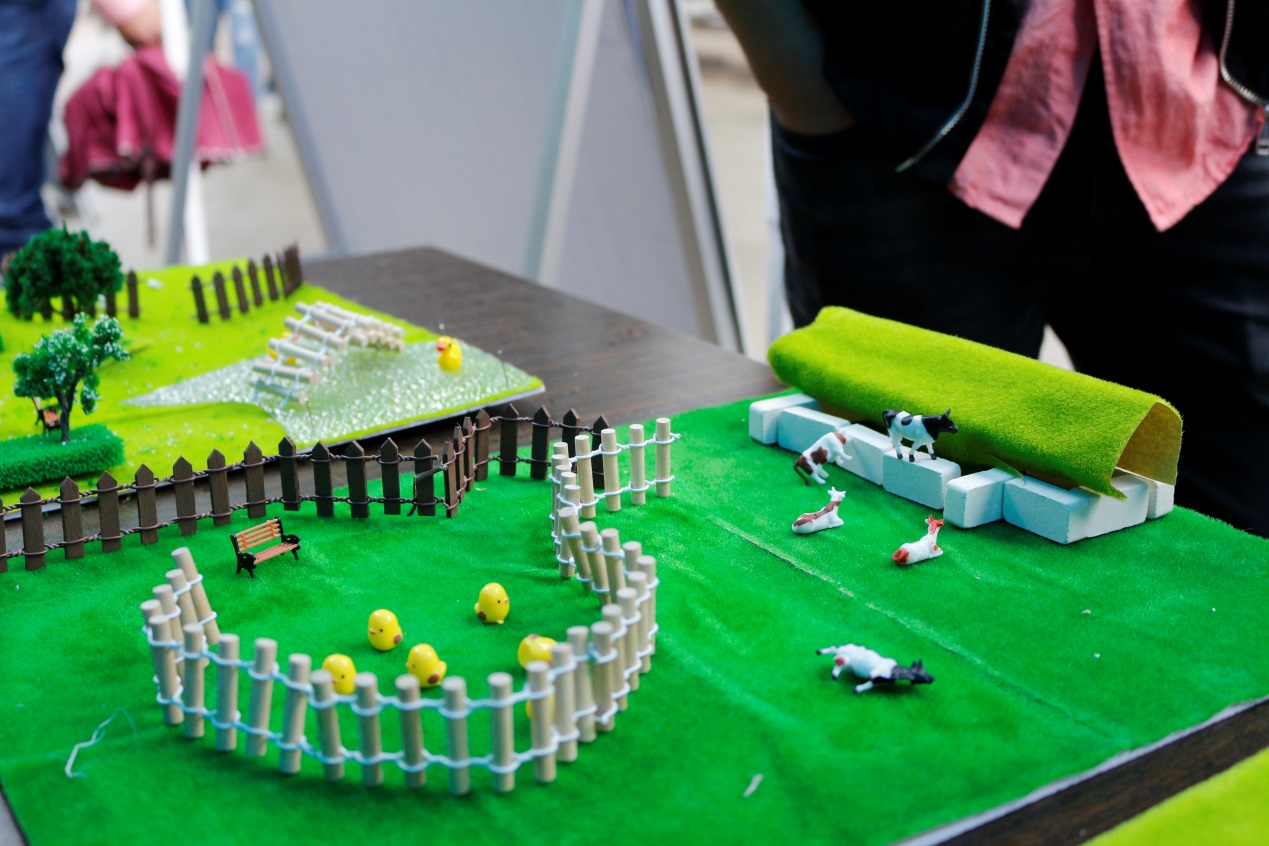 而农业体验展区则设置了趣味农业、生态农业、水稻栽培模拟等展区。在趣味农业区,还有制作泥塑和农业工具拼图等游戏。同学们通过将手中的泥巴捏成农具或农作物的形状,不仅对各种农具有了深刻的认识,同时也体验了泥塑这门古老的手艺。另外在生态农业区,同学们还根据自己的想象搭建了理想中的生态农业的沙盘模型并借此表达了对未来农业的憧憬。