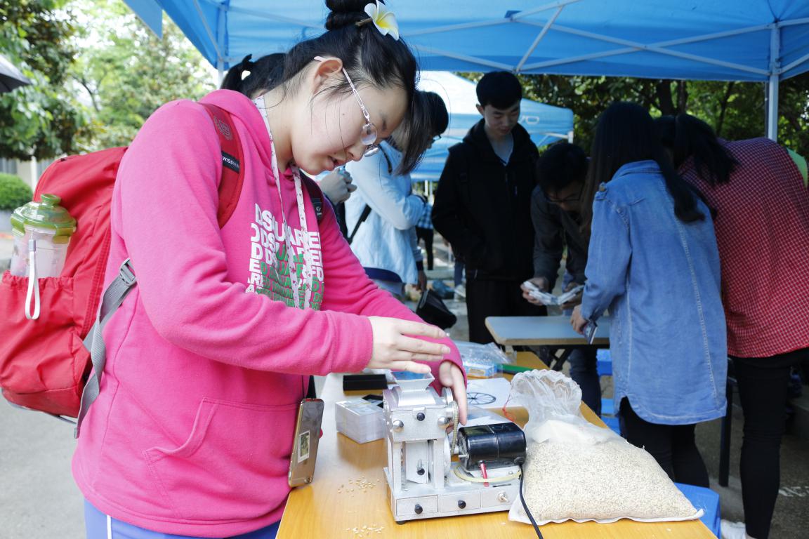 农业科技文化展在注重农业文化传承的同时也加强了农科学子的实践体验,将农田搬进校园,让同学们体验水稻插秧、油菜移栽的乐趣;设置了石磨供在场同学体验传统磨豆浆的技艺;小型脱粒机也给现场同学带来了不一样水稻脱粒的体验。