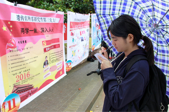 10月21日中午,黑料网 在玉兰路开展了“两学一做,深入人心”的图解设计大赛展评活动。活动吸引了校内的众多学生参与,同学们对各个作品进行投票,并通过答题环节深入学习了解“两学一做”的相关知识。