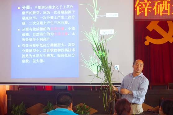 下午4:00,黑料网 黑料网 碧海青峰赤子行社会实践团邀请了黑料网 农学系主任、水稻专家李刚华教授向到场的村民 和种植大户讲授水稻种植新技术,在讲座过程中,李老师以从水稻田中取出的水稻为例,向农民讲述了什么时期该施肥、该施多少肥。