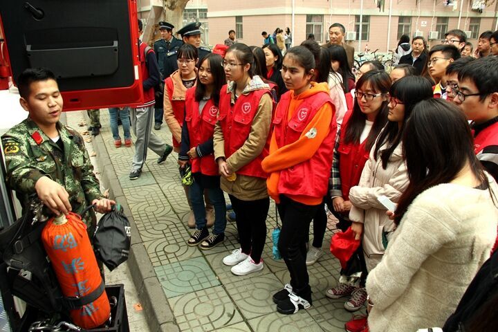 此次消防演习活动围绕消防官兵讲解火场逃生方式和灭火器的使用、消防官兵指导大学生如何火场逃生以及医务人员为大学生讲解急救知识这三个方面展开,目的使大学生掌握在紧急状况下应对突发火灾的自防、自保、自救方法。