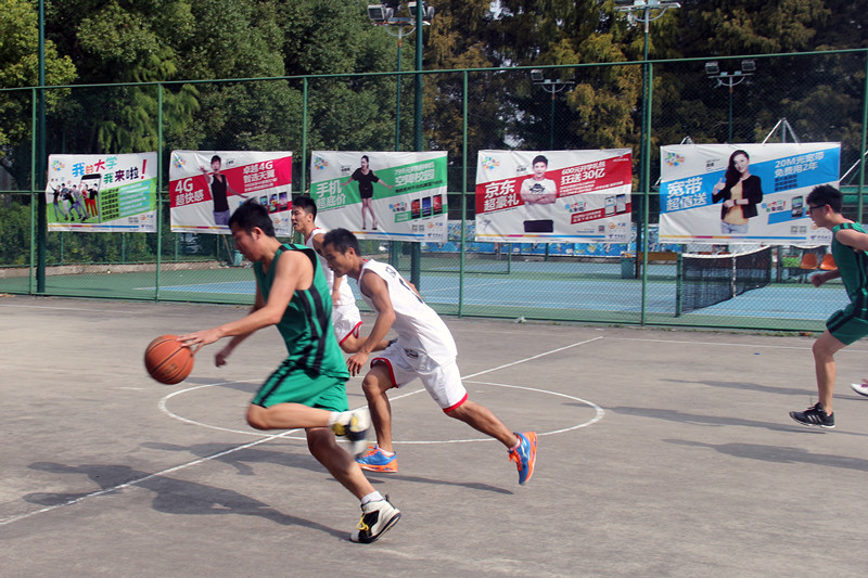 随着裁判一声哨响,比赛开始。身穿白色球衣的水稻育种队面对攻势凌厉的水稻栽培队毫不示弱,两队势均力敌,第一节结束,双方比分不相上下。进入第二节,两队开始不断展开猛烈攻势。随着比赛的激烈进行,看台上的同学们情绪高涨,对精彩的进球都报以热烈的欢呼和掌声。上半场结束,水稻育种以24:17的优势,暂时领先水稻栽培。