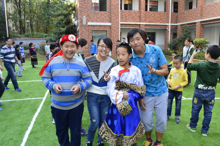 玄武区特殊教育学校共有39人,分高、中、低年级。抵达学校后,辅导员大队长就让孩子们在操场上集合。首先,他简单的介绍了今天的活动流程,同时,给孩子们发放了农学122班收集的爱心明信片。随后,辅导员根据大家的喜好和能力进行分组活动,有喜爱民族服装的,来拍个照;有喜欢美术的,去做橡皮泥,去做树叶贴画;还有喜欢运动的,去踢足球,玩老鹰捉小鸡、丢手绢等;还有低年级的小朋友,一起来认水果。