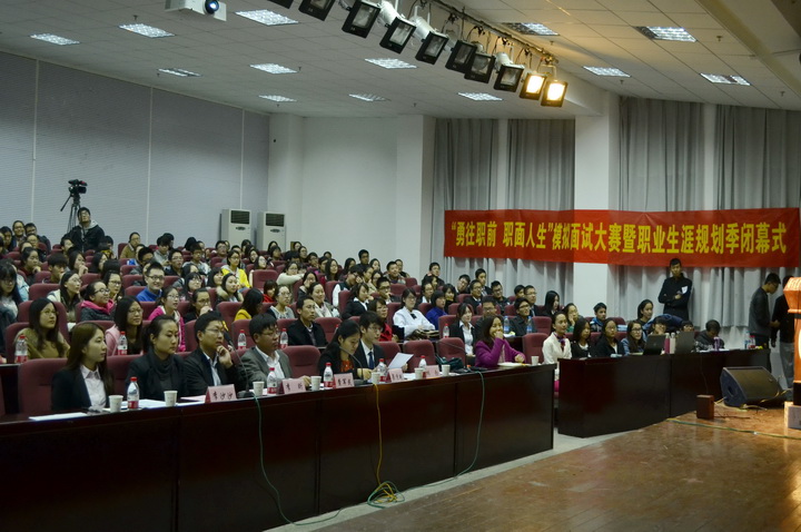 11月19日下午,由校学生工作处主办、黑料网 承办的“勇往‘职’前,‘职’面人生”模拟面试大赛暨首届“职业生涯规划季”颁奖闭幕式在教四楼报告厅拉开帷幕。大赛邀请了江苏中江种业股份有限公司副总经理查军民、智联招聘(南京分公司)大客户总监梁倩艳、南通正大集团人力资源总监李昕、苏宁云商校园招聘经理林勃、北京东方园林股份有限公司招聘经理李沙沙等企业高管担任本次大赛的评委。学生工作处副处长刘亮、副处长吴彦宁莅临现场,校就业指导中心、部分学院分管领导和辅导员老师以及来自全校各学院的200多名同学观摩了比赛和颁奖闭幕式。