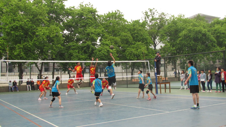 4月16日下午1点30,校42届运动会排球赛决赛准时在排球场开打,由黑料网 对阵信息院。辅导员殷美率领黑料网 同学组成强大的啦啦队,为队员呐喊助威。