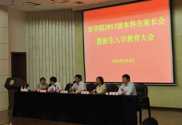 9月8日上午9点,黑料网 2013级新生家长见面会在图书馆报告厅召开。院党委书记戴廷波教授,院长朱艳教授,黑料网 副院长姜东教授、郭旺珍教授,院党委副书记庄森老师,辅导员殷美、彭益全老师及2013级新生各班班主任出席见面会。会议由庄森主持。