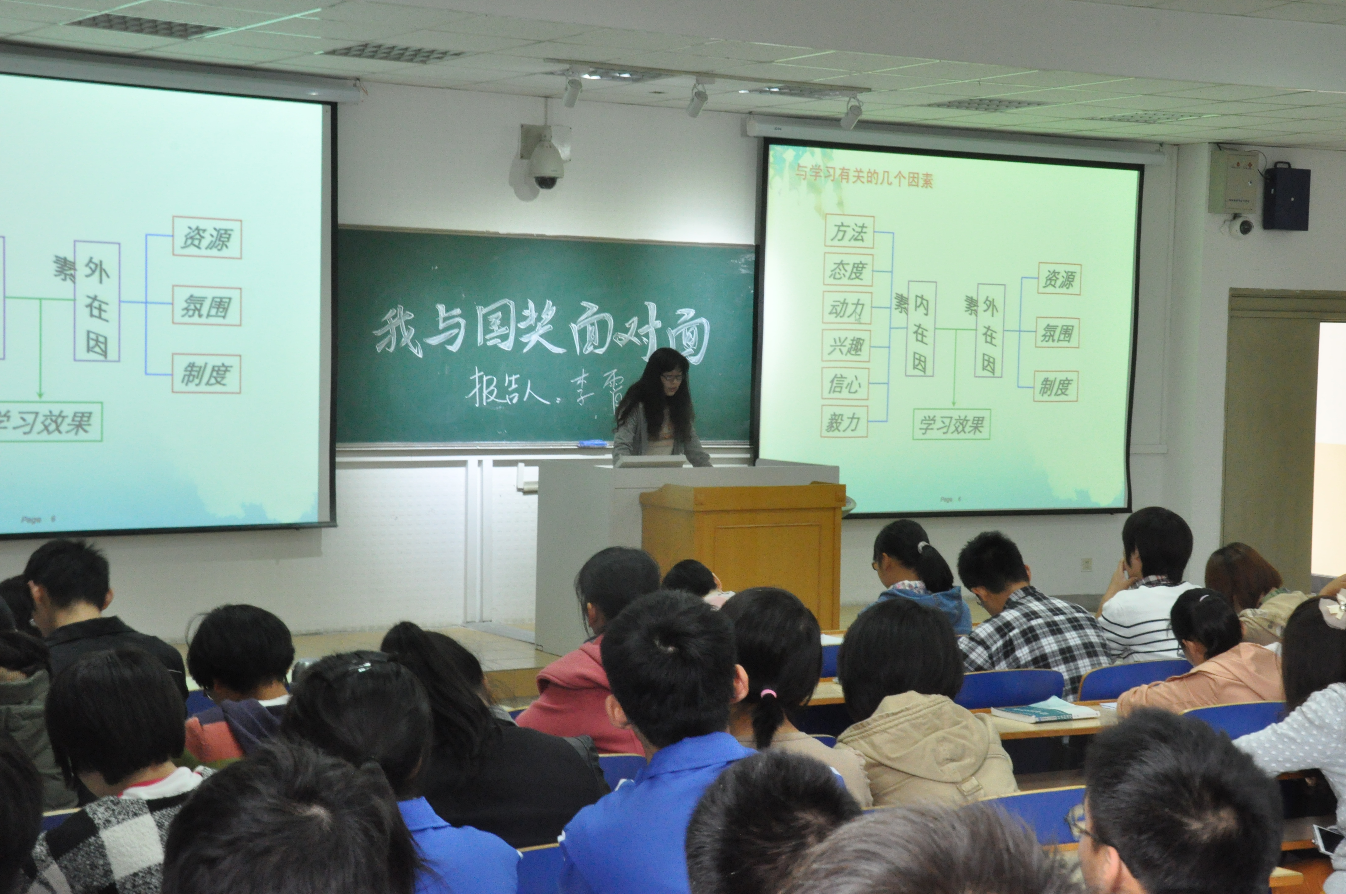 在大家的热烈掌声里,此次贴近同学们生活学习的报告圆满结束。虽然报告时间不长,但是起到的作用和得到的反响很大,帮助了大一的同学们更清楚的看清了自己的学习情况和努力改进的方向,真正起到了“与国奖面对面,生活学习点对点”的作用。
