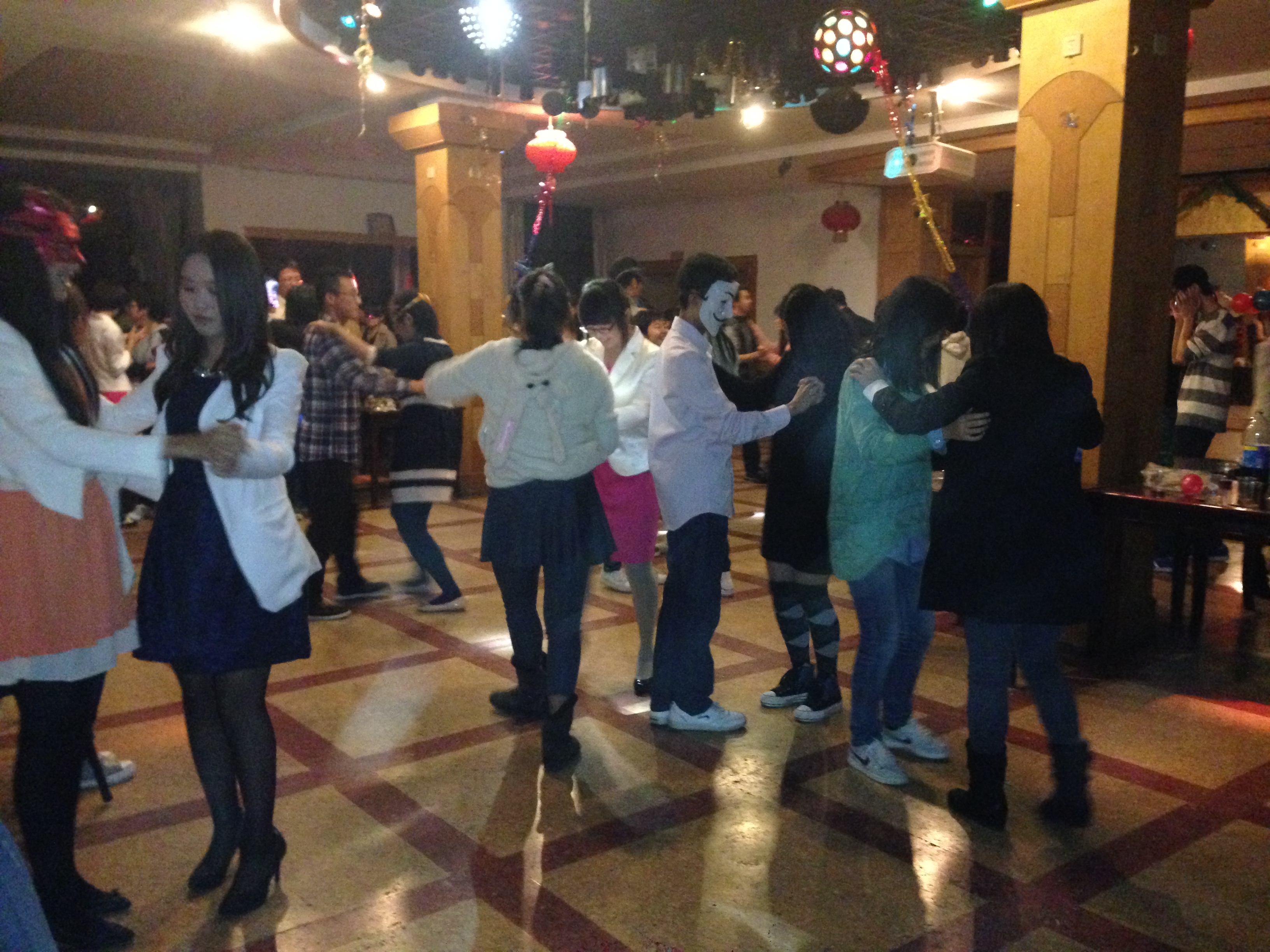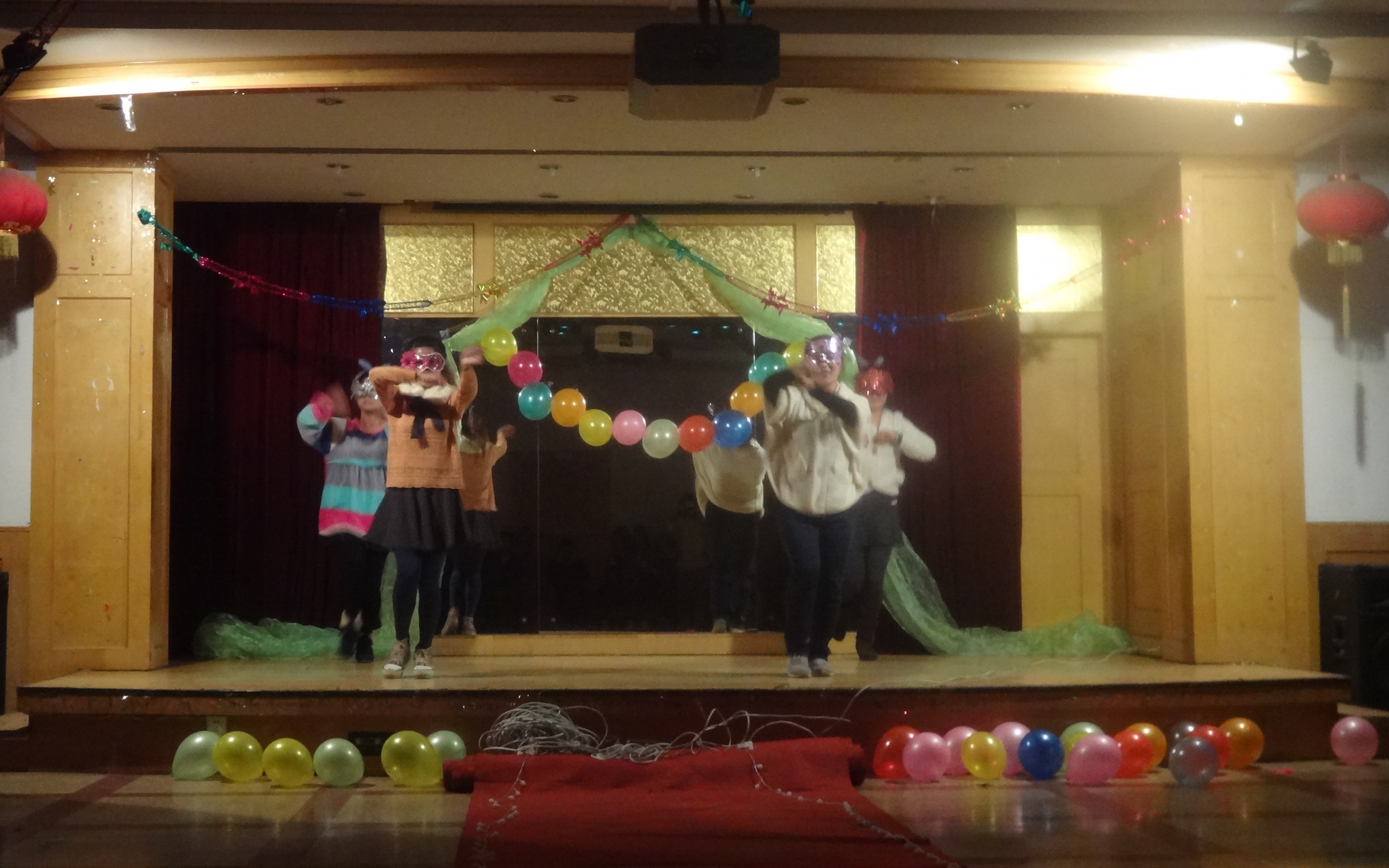开场兔子舞由艺术团舞蹈团领舞两分钟,接着带动舞会现场所有人一起加入到舞蹈行列,大家彼此搭肩,整齐的合着节拍跳动,气氛热烈。接下来的速配环节,入场拿到号码牌的男女生找到与自己号码相同的搭档,两搭档一齐亮相,以不同的方式走上红地毯,大家用不同的方式创意的走上舞台,或嬉笑搞怪,或温馨柔美,大家其乐融融。